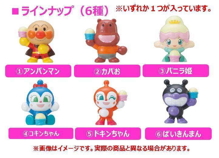 アンパンマン、ばいきんまん、かばお、 バニラ姫、ドキンちゃん、コキンちゃん、 の6種類のどれかが出てきます。